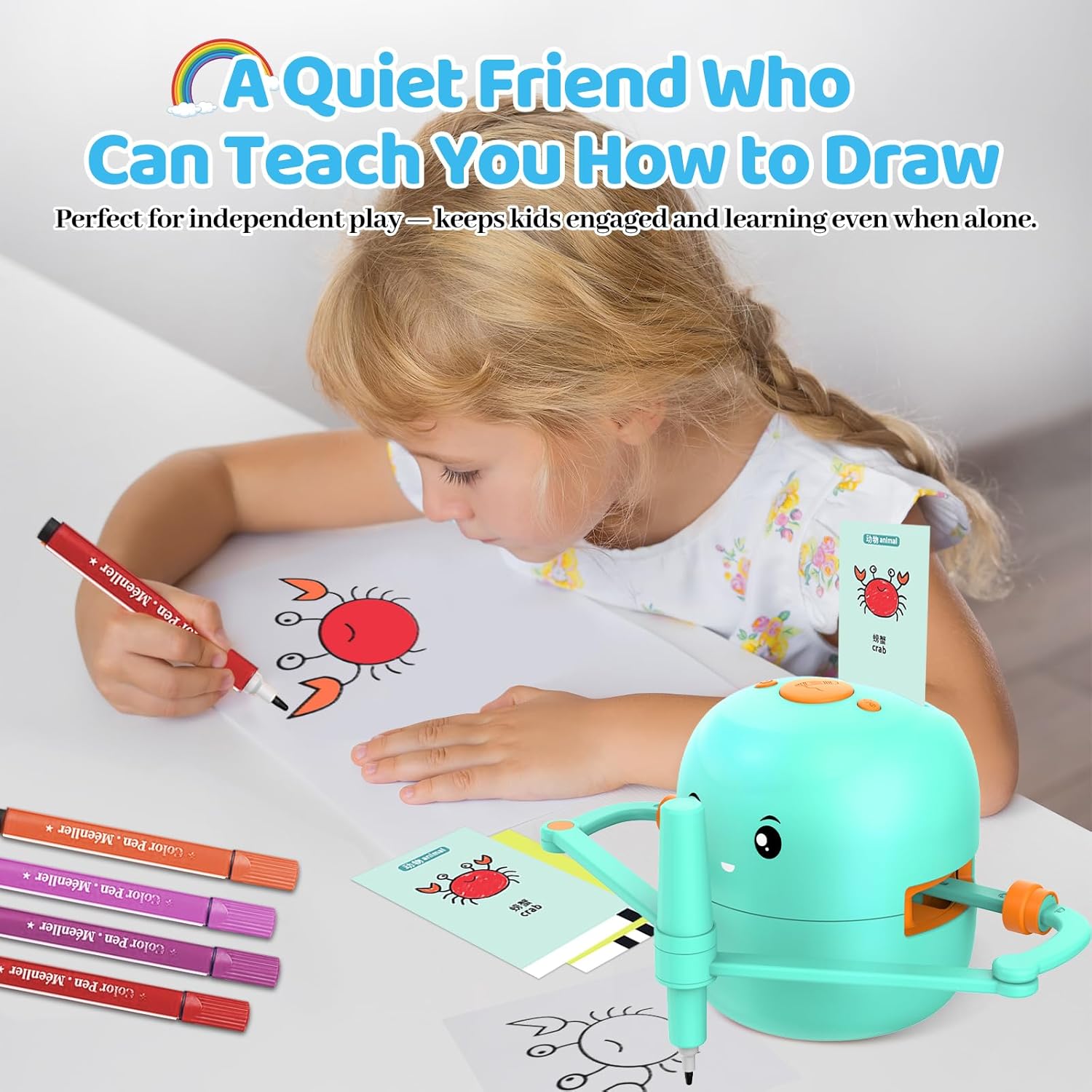 Interactive STEM art robot with 150 learning cards and 17 colorful pens. Voice-guided, step-by-step drawing for fun and creative learning.